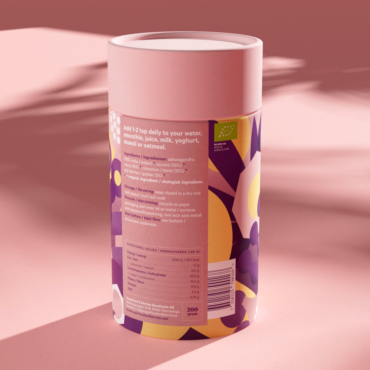 Ashwagandha (35 %) ist ein Kraut, das traditionell wichtig für Stress und Konzentration ist. Ashwagandha wird auch in der natürlichen Gesundheit verwendet, um zur Aufrechterhaltung eines normalen Cortisol- und Schilddrüsenhormonspiegels beizutragen. Lucuma (35 %) ist eine Superfrucht aus Südamerika und steckt voller Nährstoffe. Lucuman ist reich an Antioxidantien, Kalium, Beta-Carotin, Eisen, Proteinen, Ballaststoffen, Zink und Kalium und wird traditionell als „Gott der Inkas"bezeichnet. Maca (15 %) gilt als Adaptogen, das zur normalen Fähigkeit des Körpers beiträgt, mit den schädlichen Auswirkungen von Stress umzugehen und die normale physiologische Funktion wiederherzustellen und das Hormongleichgewicht im Körper zu regulieren. Die Karotte enthält mindestens fünfmal mehr Protein als Reis und viermal mehr Ballaststoffe als Kartoffeln. Diese Wurzel enthält über 55 verschiedene Nährstoffe und hat ein breites Spektrum an Vitaminen, Mineralstoffen, Aminosäuren, Lipiden, Carotinoiden, Polyphenolen und Eucuma-Alkaloiden. Zimt (10 %) ist vollgepackt mit Antioxidantien, die den Körper vor oxidativem Stress schützen. Es ist auch reich an Kalzium, Ballaststoffen, Eisen, Flavanolen und Mangan. Goji-Beeren (5%) sind eines der nährstoffreichsten Lebensmittel der Welt. Der Gehalt an Vitamin C ist höher als in Orangen und wirkt im Körper als Antioxidans und trägt zu einem normalen Immunsystem bei. Die Mineralstoffe Eisen und Zink kommen in hohen Mengen vor. Eisen trägt unter anderem zu einer normalen Blutbildung bei, während Zink zur Hormonregulation beiträgt.